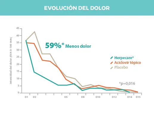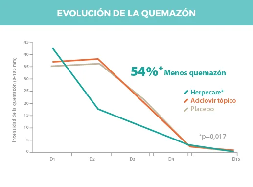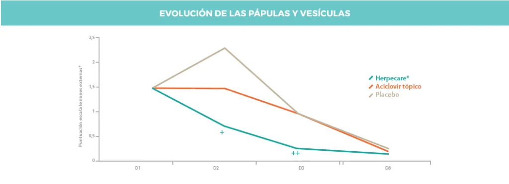 Además, Herpecare® también muestra una mayor disminución de las lesiones externas como pápulas y vesículas desde el primer día.